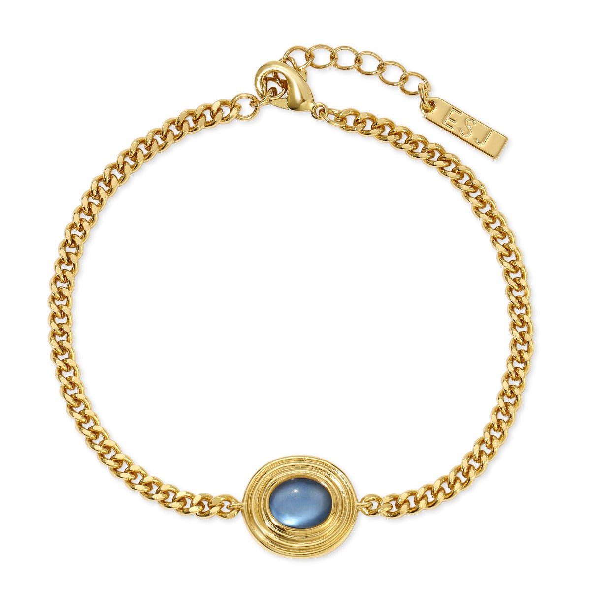 A modern take on a vintage design. this curb chain bracelet features Saturn-inspired rings surrounding a stunning blue mother of pearl stone.